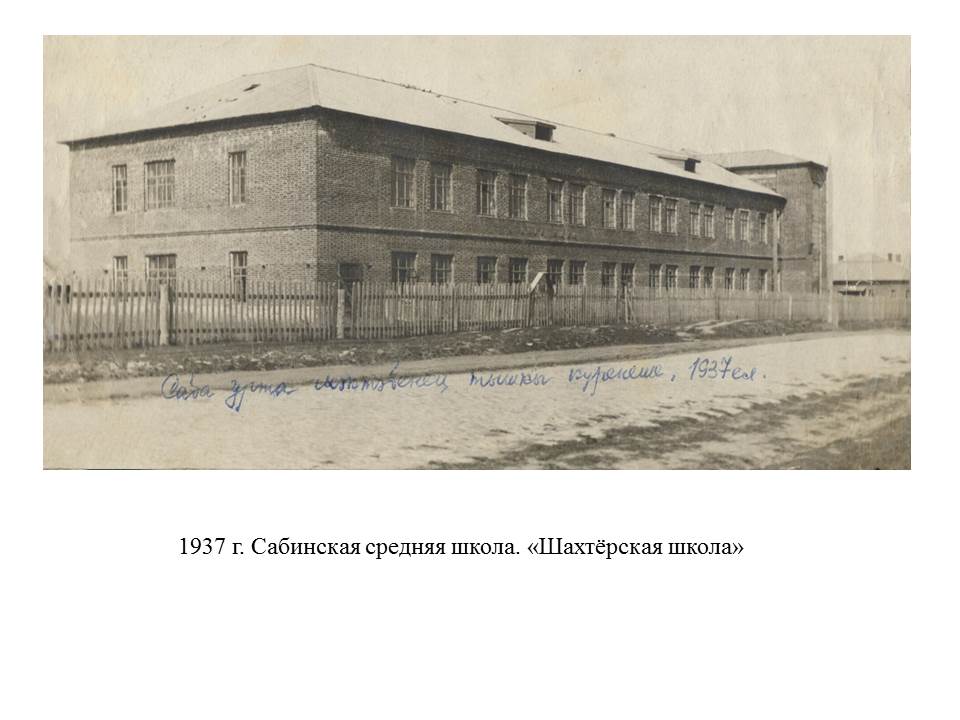 1925 елда ачылган Крестьян яшьләре мәктәбе 1931 елга кадәр эшли. 1931 елның җәендә аны сүтеп шул ук Совет урамының төньяк ягына күчереп салалар, ул бинада соңрак колхоз һәм төрле совет оешмалары өчен белгечләр әзерли башлыйлар. 1931 елда Сабада Тукай һәм Җәлил урамнары кисешкән урында башлангыч сыйныфлар мәктәбе төзелә. Һәм шул ук елны авыл читендәрәк, колхоз әвеннәре урнашкан җирдә кызыл кирпечтән ике катлы мәктәп өчен зур яңа бина салына башлый. Бу мәктәпне Донбасс шахталары идарәсеннән килгән акчага төзиләр, шуңа ул халык теленә “шахтёрлар” мәктәбе дип кереп кала. Мәктәп тулысынча 1934 елда төзелеп бетә. Беренче директоры - Садыйков Гали Гани улы, мәктәп печатендә “Колхоз яшьләре үрнәк мәктәбе” дигән билге була. Мәктәп урта белем уку йорты статусын 1934 елда ала, ә беренче чыгарылышы 1939 елда була. Нурислам Фәтхелислам улы Насыйбуллин җитәкчелек иткән чорда, 1976 елда “шахтёрлар” мәктәбе белән янәшәдә өч катлы яңа мәктәп бинасы төзелә. 1990 елда аңа терәп тагын бер корпус сафка баса.