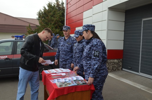 Акция Росгвардия бинасы янында узды. Күргәзмә агитация материаллары белән экспозиция җәелдерелде. Теләге булган һәркем мәгълүмат буклетларын алды һәм үз сорауларын ведомство вәкилләренә шәхсән бирде. Росгвардиячеләр җәмәгать тәртибен саклау буенча көндәлек эштә куллана торган штат коралы һәм экипировка үрнәкләрен киеп карау өчен уникаль мөмкинлек туды.